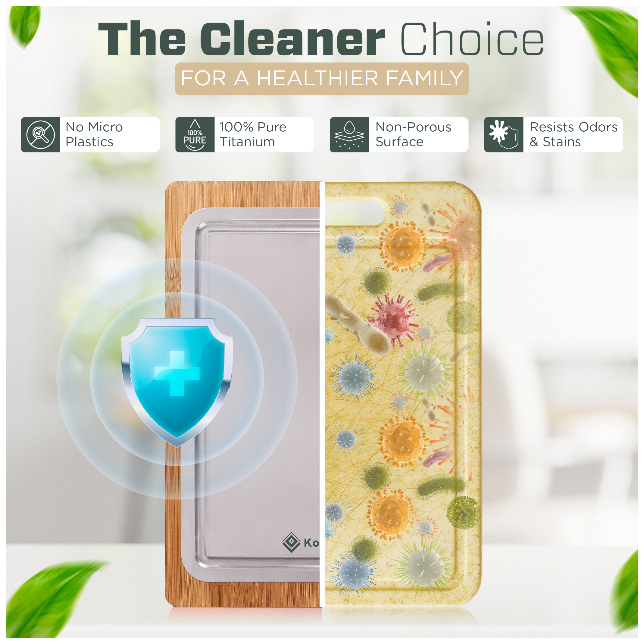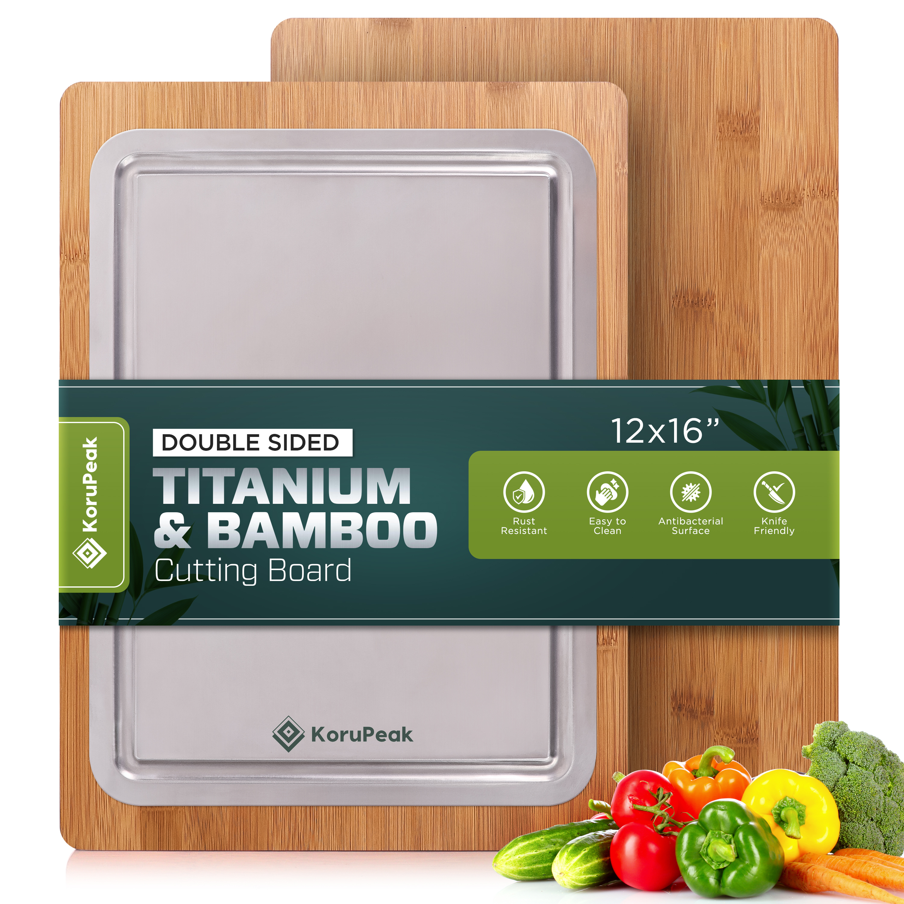 The double-sided cutting board that combines the beauty of bamboo and the durability of titanium.